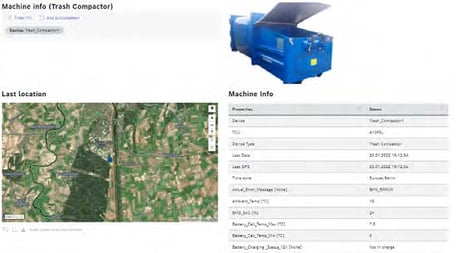 Auch aus der Ferne lässt sich der aktuelle Status des Selbstpressenden Behälters überprüfen. Mit dem optional erhältlichen Remote-Zugriff können Position, Füllstand und Ladezustand der Maschine überprüft werden. Darüber hinaus erfasst der Maschinencontroller die Druckverläufe im Hydrauliksystem, sodass auch hier im Detail die Entwicklung vom Füllstand der Presse und des Akkus nachvollzogen werden können.